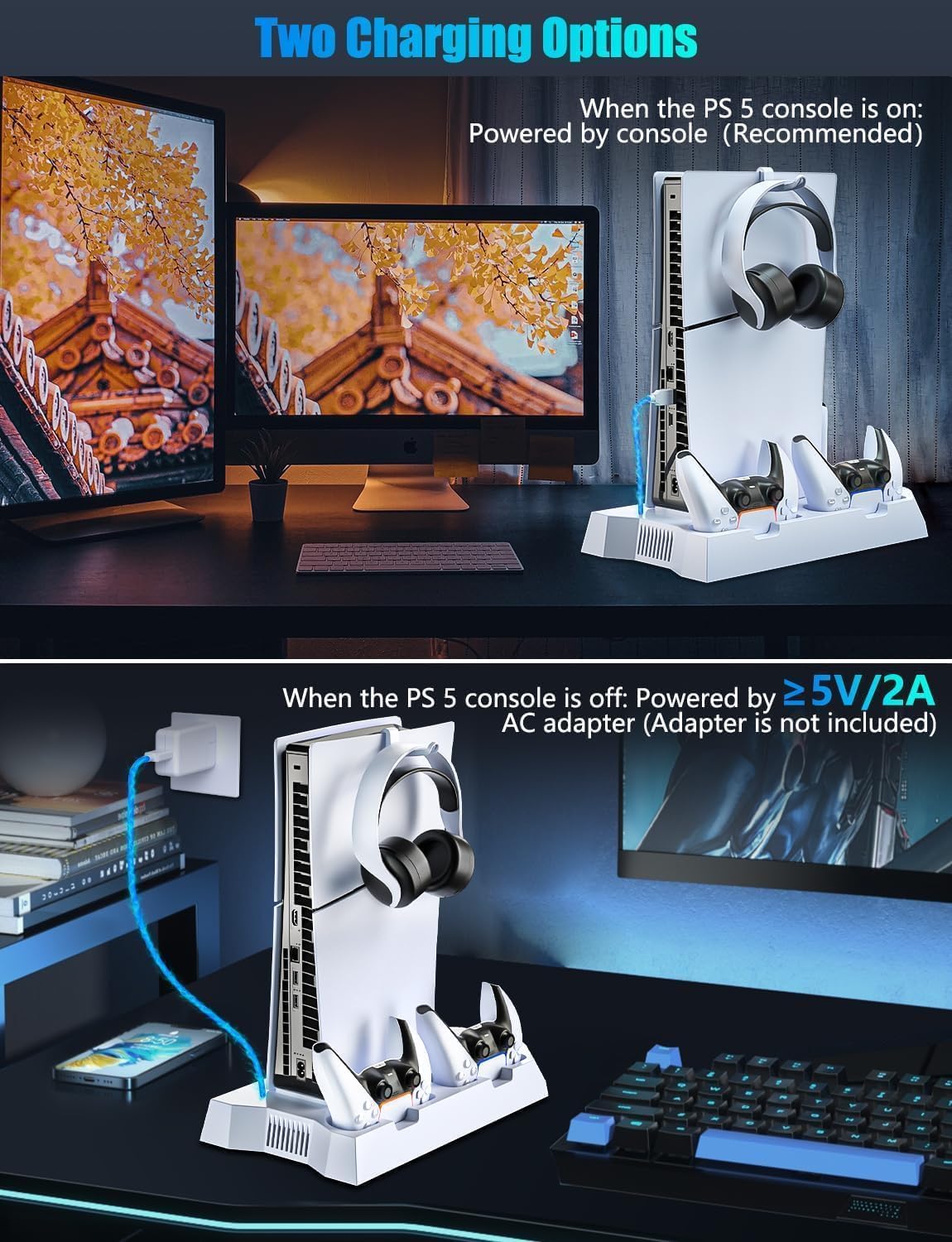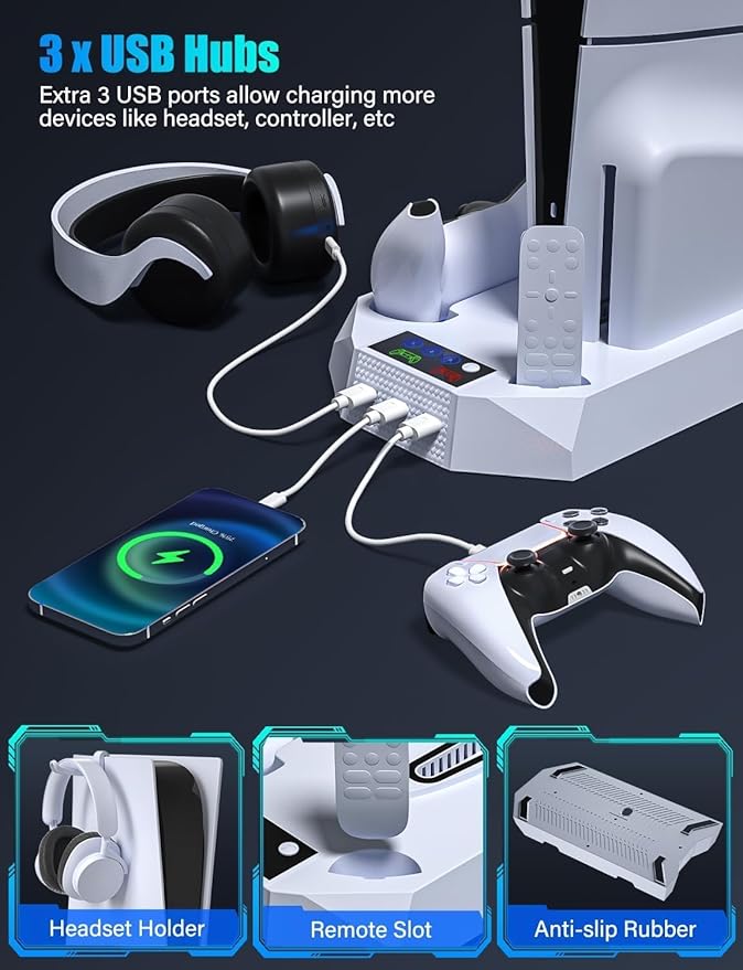 قاعدة عمودية للبلايستيشن 5 / Slim / Pro – شاحن مزدوج لليدات، مروحة تبريد، 3 منافذ USB، وحامل سماعة